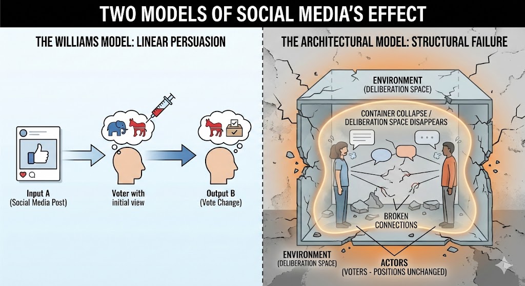 Williams's experiments show that social media doesn't persuade. But persuasion was never the mechanism of healthy democratic discourse. Understanding was. Convergence was. Trust-building was. These require architecture that social media structurally cannot provide.